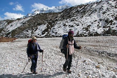 The day started with a shining sky. But as we advanced towards the Green Lake, Base Camp at 4934 Mt, the cloud veiled the entire region. The weather became windy and cold. We continued our journey and after about 6 hours' walking through the moraine zone, we finally reached Green Lake, Base Camp, which is also the base camp for climbing Mt. Kangchenjunga (8585 Mt) from India. Though we did not gain much height that day, it was the most strainous day of the entire trek. It started drizzling just as we entered our camp site.